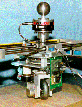The simplest cobot, which nevertheless exhibits all essential behaviors, is the unicycle cobot shown in figure 1. It has a two-dimensional (planar) workspace. Constraint surfaces, defined in software, delimit excluded areas of the plane. The Cartesian rails serve only to keep the unicycle upright, and are not needed in the designs which will follow.
